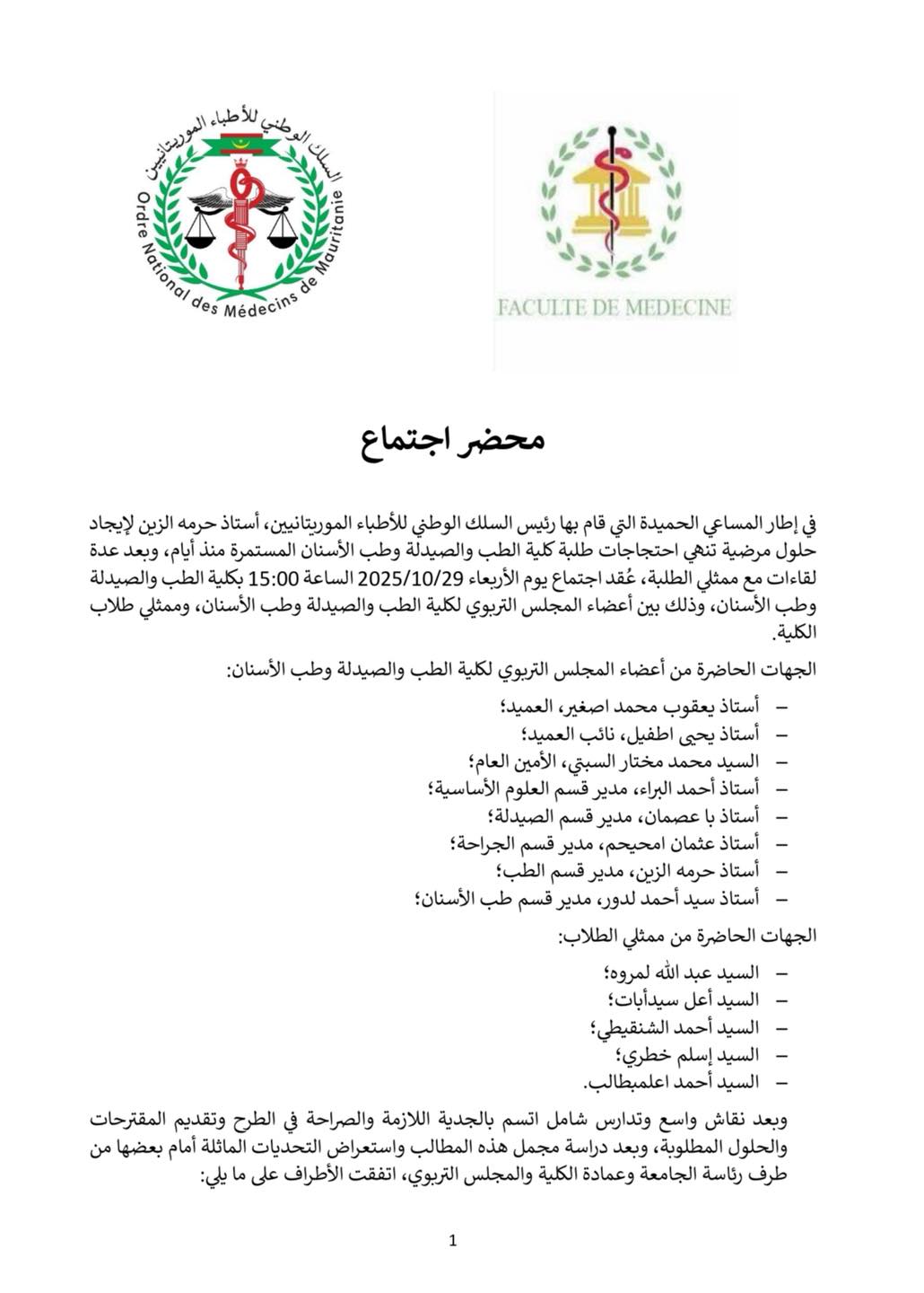 وقّع ممثلون عن كلية الطب بجامعة نواكشوط، وممثلون عن الطلاب اتفاقا يقضي بتعليق الإضراب الشامل الذي دخله الطلاب منذ أسبوع، وذلك بوساطة وضمانة من سلك الأطباء الموريتانيين.