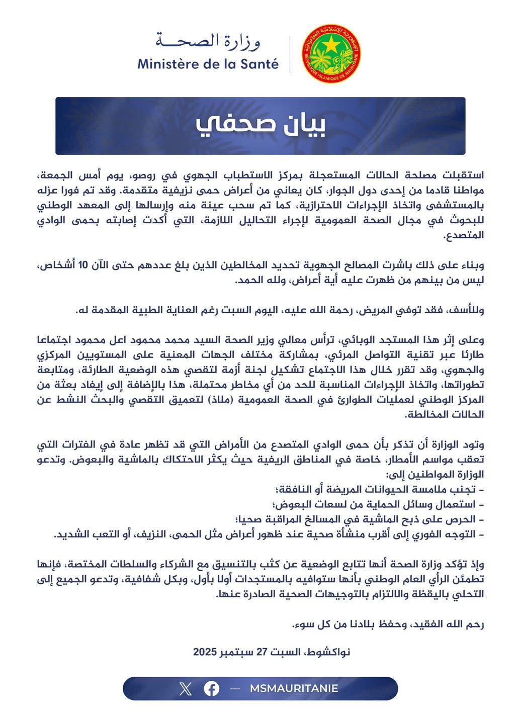 استقبلت مصلحة الحالات المستعجلة بمركز الاستطباب الجهوي في روصو، يوم أمس الجمعة، مواطنا قادما من إحدى دول الجوار، كان يعاني من أعراض حمى نزيفية متقدمة. وقد تم فورا عزله بالمستشفى واتخاذ الإجراءات الاحترازية، كما تم سحب عينة منه وإرسالها إلى المعهد الوطني للبحوث في مجال الصحة العمومية لإجراء التحاليل اللازمة، التي أكدت إصابته بحمى الوادي المتصدع.