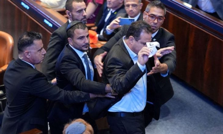 وأظهر البث المباشر رئيس الكنيست أمير أوحانا وهو يطلب من الأمن إخراج عودة وكاسيف ـ وهما من الجبهة الديمقراطية للسلام والمساواة في إسرائيل ـ من الكنيست، وهو ما تم بسرعة كبيرة وبقوة.