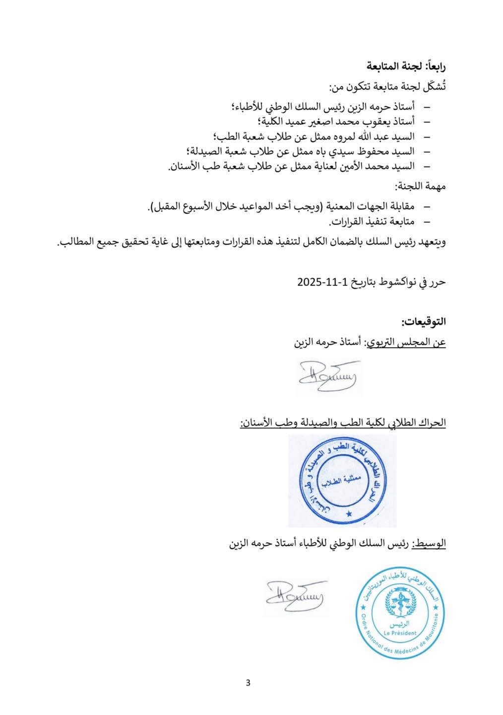 واتفقت الأطراف على تشكيل لجنة متابعة تضم رئيس السلك الوطني للأطباء الأستاذ حرمه الزين، وعميد كلية الطب الأستاذ يعقوب ولد محمد اسغير، وممثل طلاب شعبة الطب عبد الله لمروه، وممثل طلاب شعبة الصيدلة محفوظ سيدي باه، وممثل طلاب شعبة طب الأسنان محمد الأمين