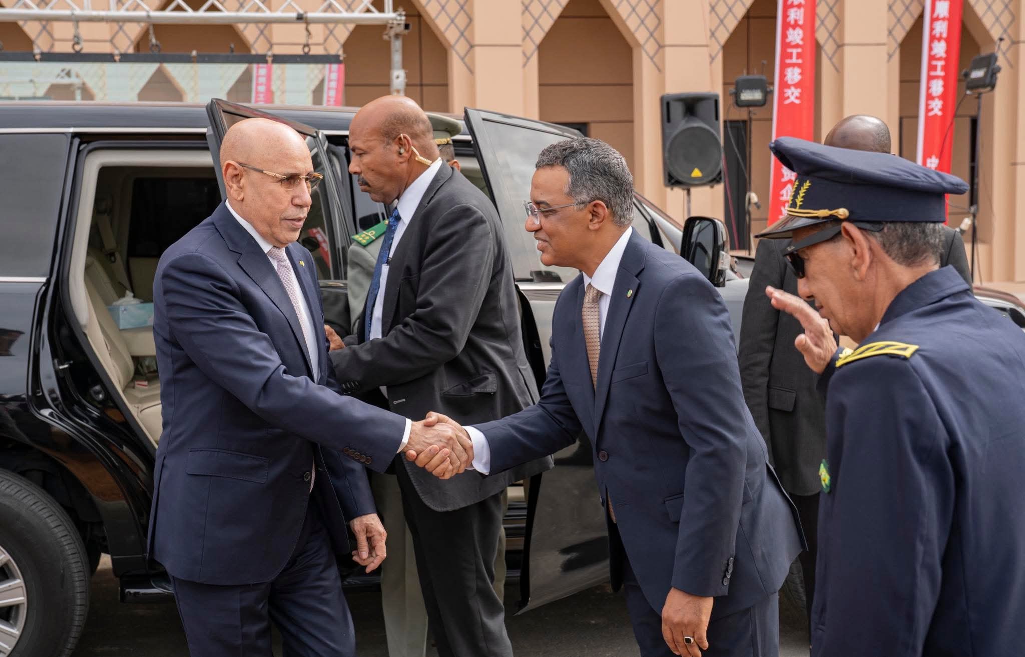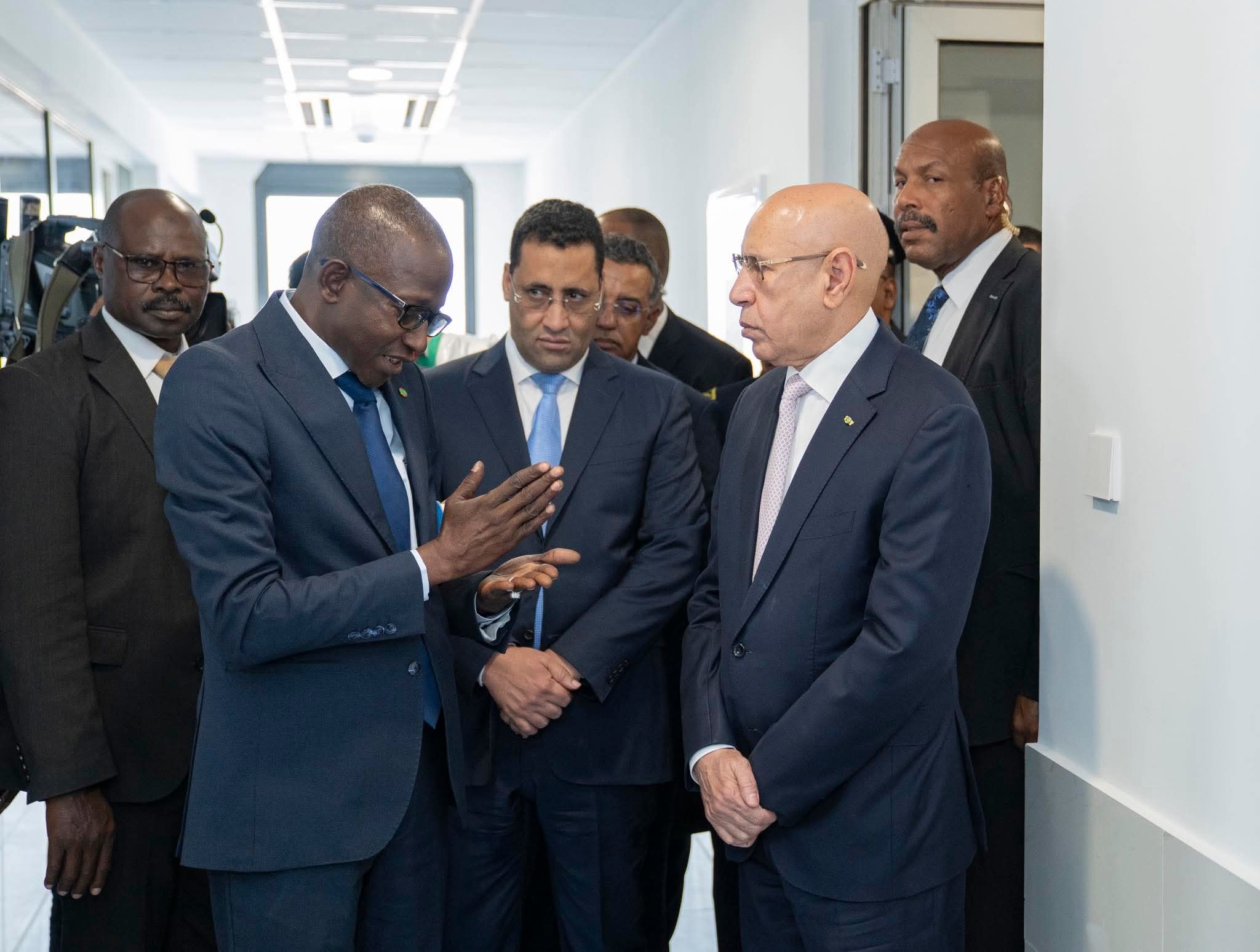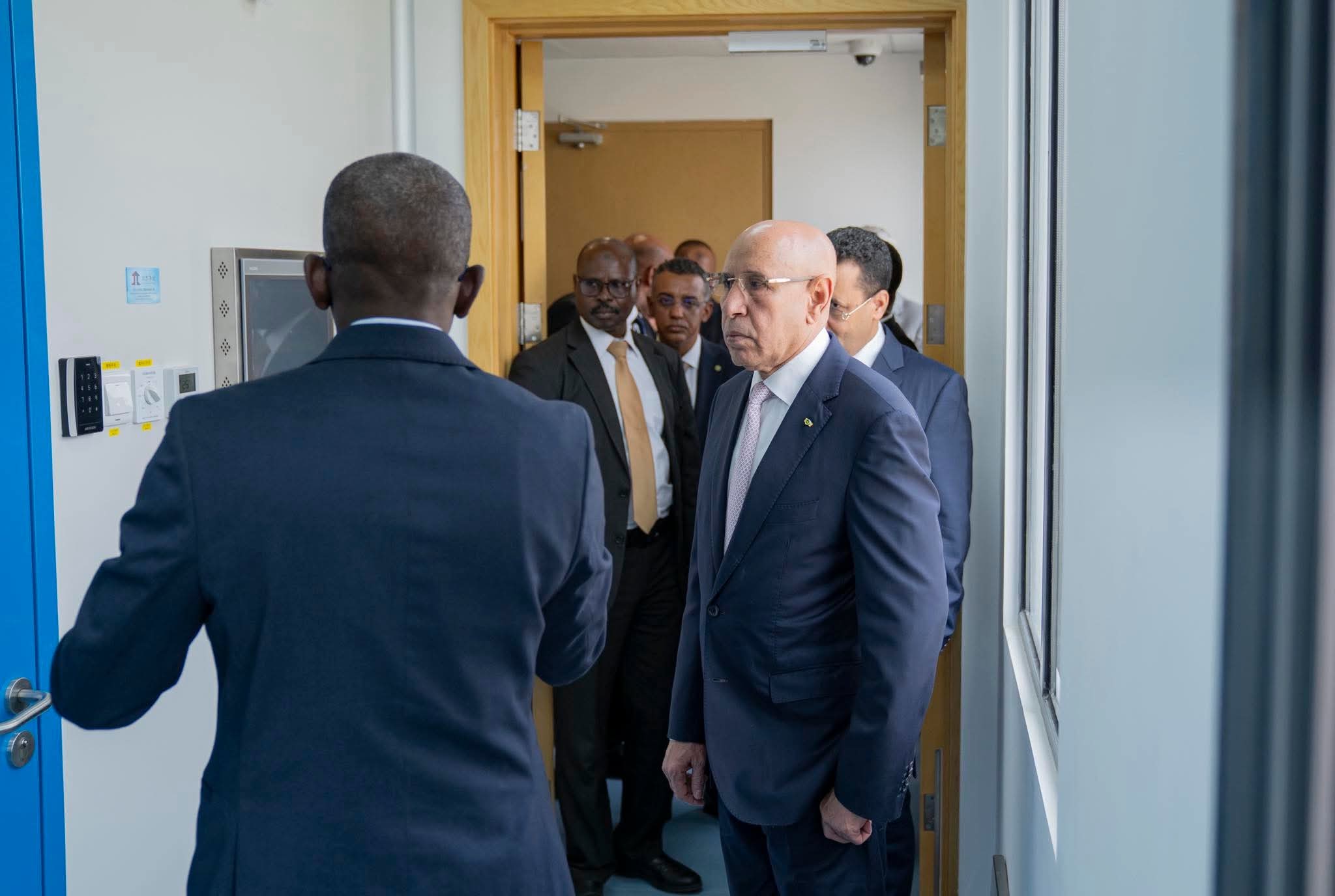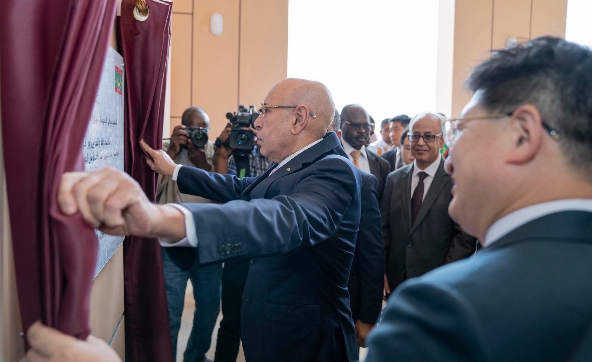 فخامة رئيس الجمهورية، السيد محمد ولد الشيخ الغزواني، يقطع الشريط الرمزي، ويزيح الستار عن اللوحة التذكارية إيذانا بتدشين المعهد الوطني للبحوث في مجال الصحة العمومية.
