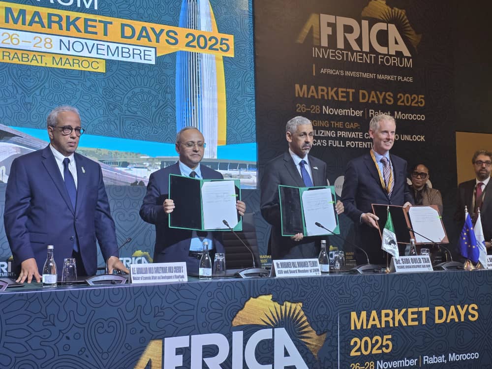 وقّع وزير الشؤون الاقتصادية والتنمية، عبد الله سليمان الشيخ سيديا، على هامش منتدى الاستثمار الأفريقي 2025، اتفاقية تمويل كبرى بين البنك الأفريقي للتنمية والبنك الأوروبي للاستثمار والشركة الوطنية للصناعة والمناجم (سنيم)، بقيمة إجمالية تبلغ 275 مليون دولار، مخصّصة لزيادة الطاقة الاستيعابية لشبكة السكك الحديدية التابعة للشركة.