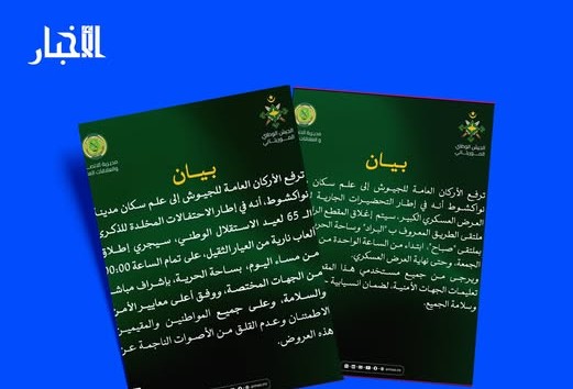 وقالت الأركان العامة للجيوش في بيان إنه ضمن احتفالات ذكرى الاستقلال سيتم عند منتصف الليل إطلاق ألعاب نارية "من العيار الثقيل" بساحة الحرية بإشراف من الجهات المختصة.