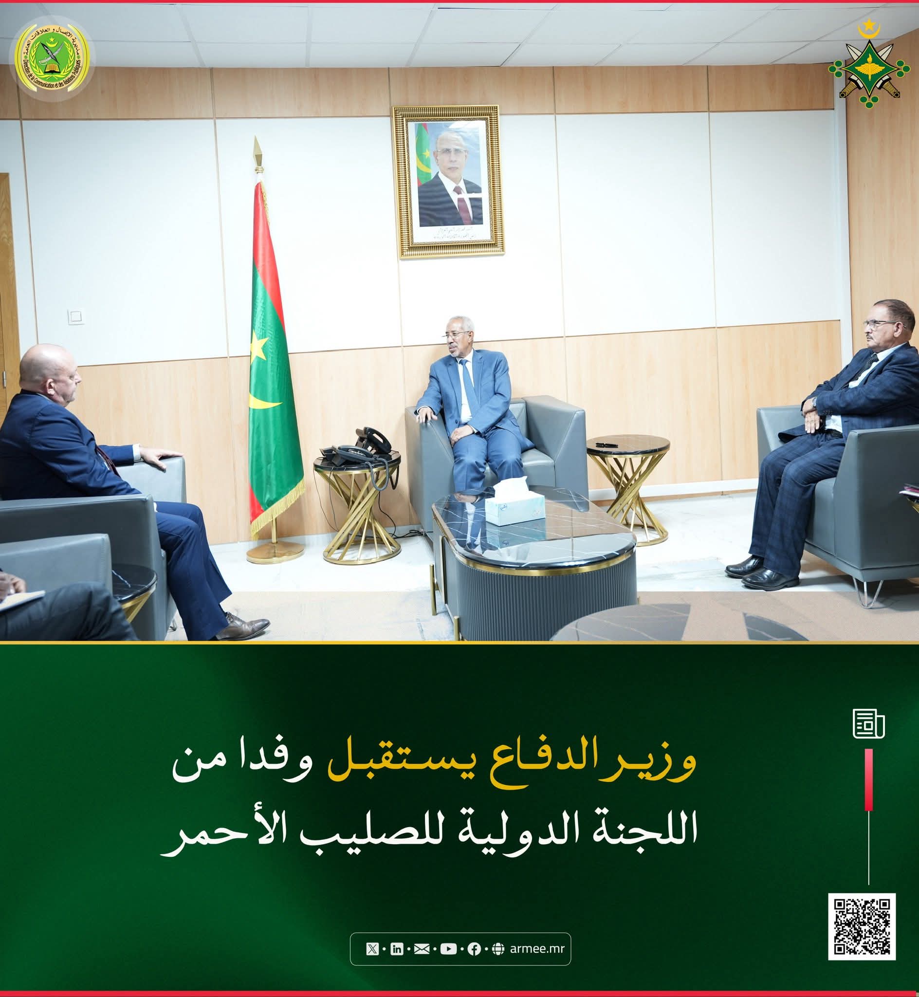 استقبل معالي وزير الدفاع وشؤون المتقاعدين وأولاد الشهداء؛ السيد حنن ولد سيدي، بمكتبه مساء اليوم الثلاثاء 09 دجمبر 2025، وفدا من اللجنة الدولية للصليب الأحمر، يرأسه السيد جين نيكولا مارتي؛ رئيس البعثة الإقليمية للجنة الدولية للصليب الأحمر في داكار، رفقة السيدة مابنتا كولي؛ مستشارة الشؤون الإنسانية، والسيد عبد الله ممادو با؛ المكلف بالشؤون الإنسانية للجنة الدولية للصليب الأحمر بجمهورية اليمن، والسيد آبو جالو؛ مدير مكتب اللجنة الدولية للصليب الأحمر بنواكشوط.