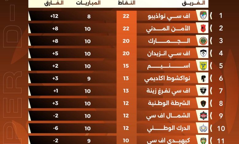 شهدت الجولة العاشرة من الدوري الموريتاني تحولًا مهمًا في صدارة الترتيب، بعدما نجح أفسي انواذيبو في انتزاع الصدارة، مستفيدًا من أدائه المتوازن ونتائجه الإيجابية، في حين صعد الأمن المدني إلى المركز الثاني، وتراجع الجمارك من الصدارة إلى المركز الثالث.