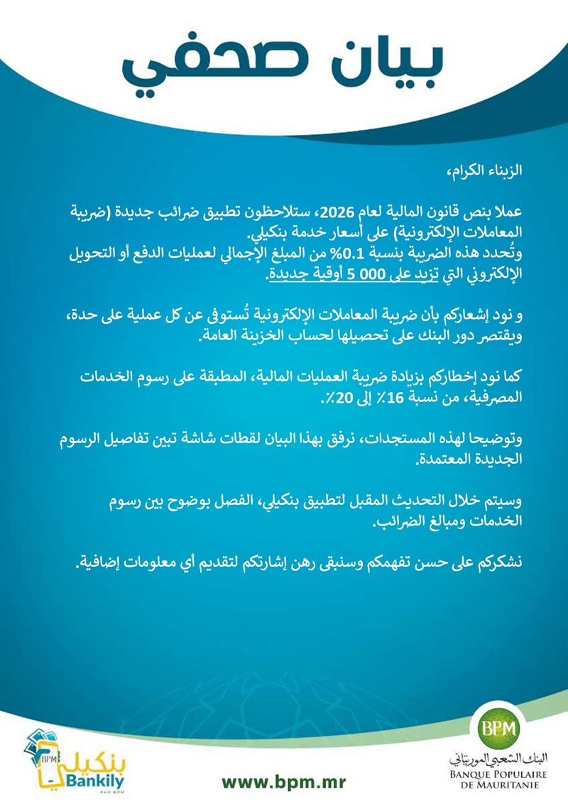 البنك الشعبي الموريتاني يبدأ تطبيق الضريبة الجديدة على المعاملات الإلكترونية
