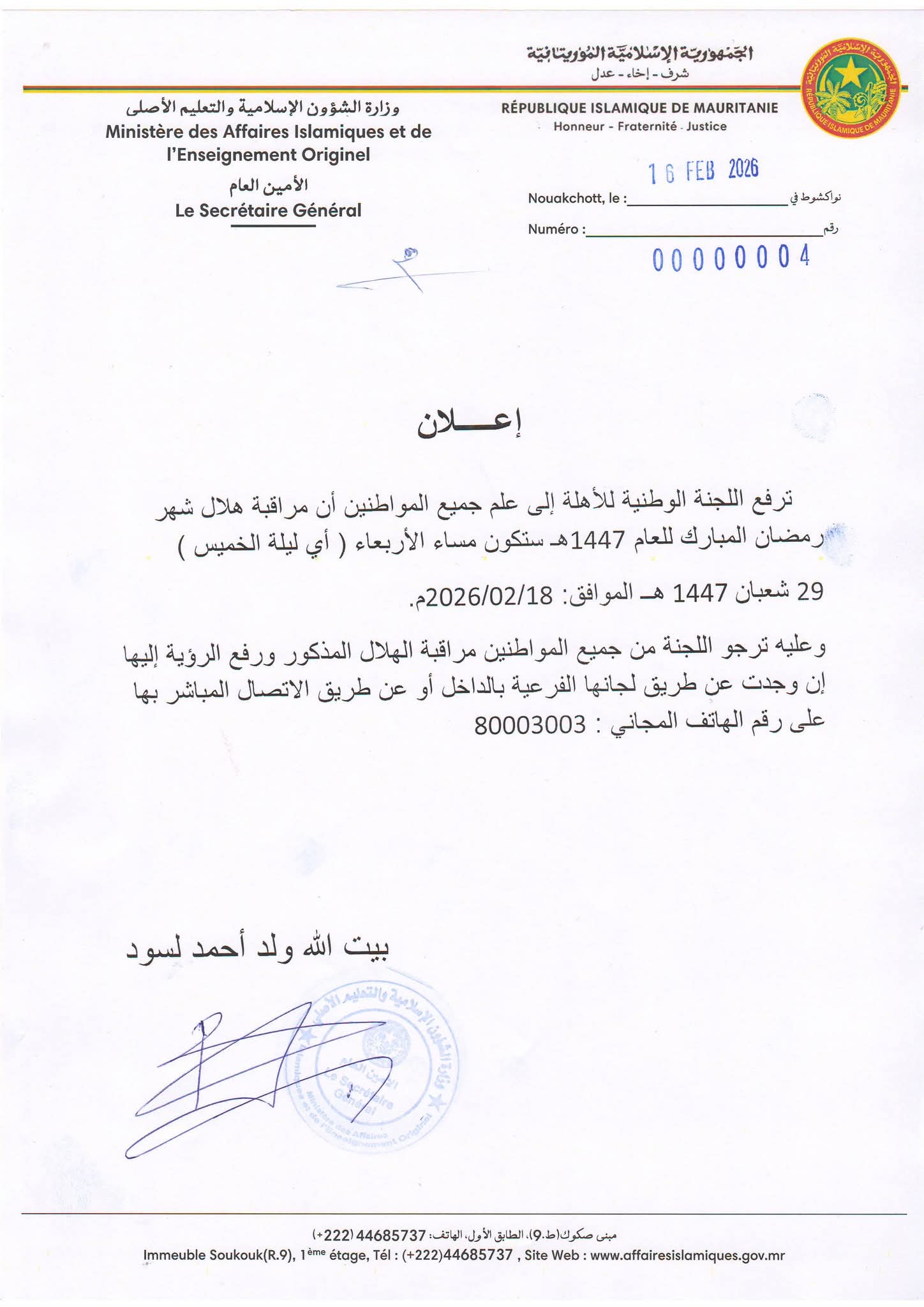 وعليه ترجو اللجنة من جميع المواطنين مراقبة الهلال المذكور ورفع الرؤية إليها إن وجدت عن طريق لجانها الفرعية بالداخل أو عن طريق الاتصال المباشر بها على رقم الهاتف المجاني : 80003003