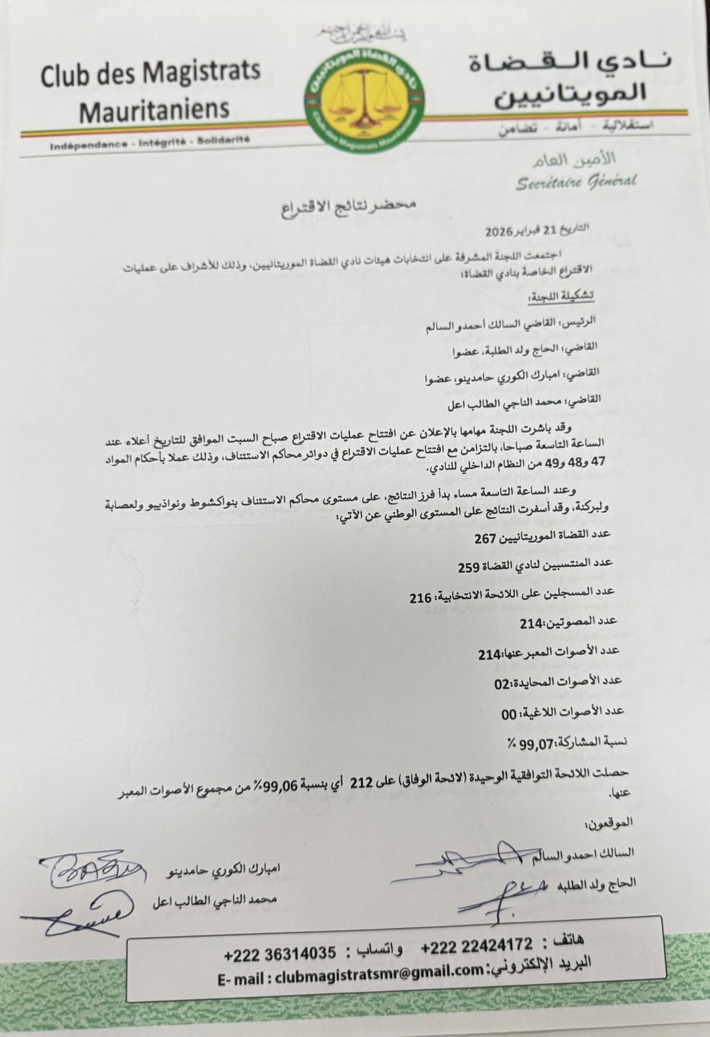 أسفرت انتخابات هياكل نادي القضاة الموريتانيين، التي جرت اليوم السبت 21 فبراير 2026، عن فوز اللائحة التوافقية الوحيدة بأغلبية ساحقة.
