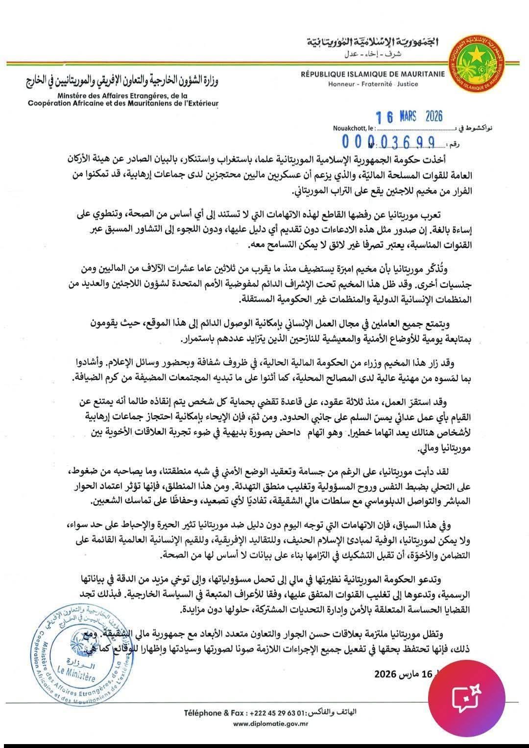 وزارة الخارجية الموريتانية تستنكر البيان الصادر عن الجيش المالي