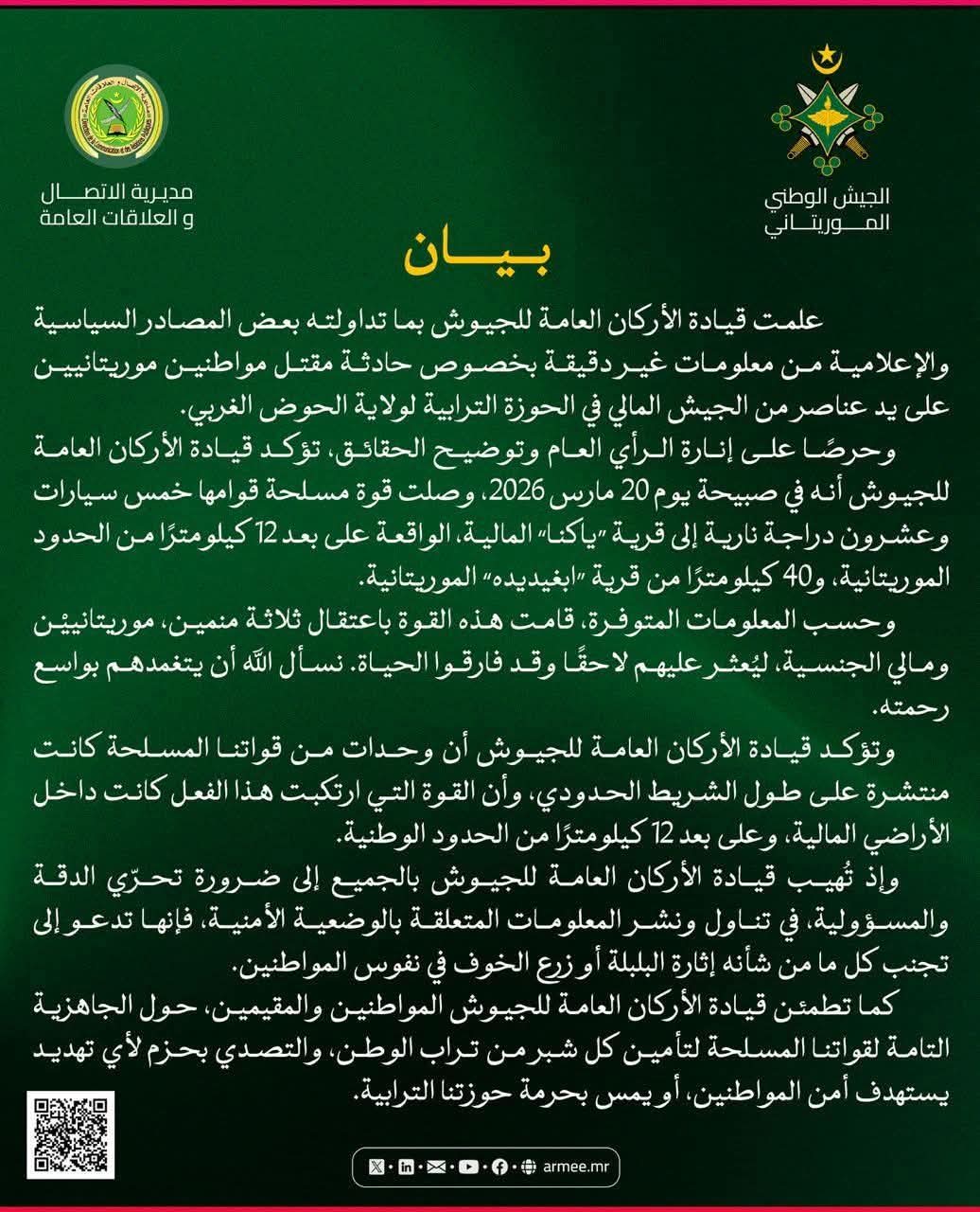 أصدر الجيش الوطني الموريتاني بيانًا رسميًا لتوضيح ملابسات حادثة مقتل مواطنين موريتانيين قرب الحدود مع مالي، بعد تداول معلومات وصفتها قيادة الأركان بأنها غير دقيقة.