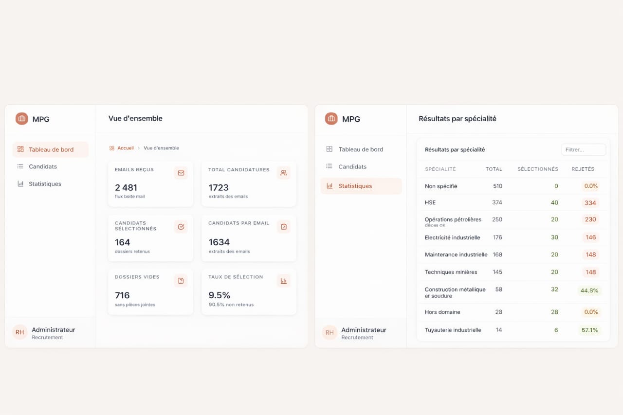 وانطلقت العملية بمعالجة 2481 رسالة بريد إلكتروني تمثل بيانات خام غير منظمة، معتمدين تطوير نظام آلي لاستخراج المعلومات وتصنيفها، ما أتاح الوصول إلى 1639 مترشحًا فعليًا بعد استبعاد التكرار، إضافة إلى رقمنة 86 ملفًا ورقيًا لإدماجها ضمن نفس المسار.