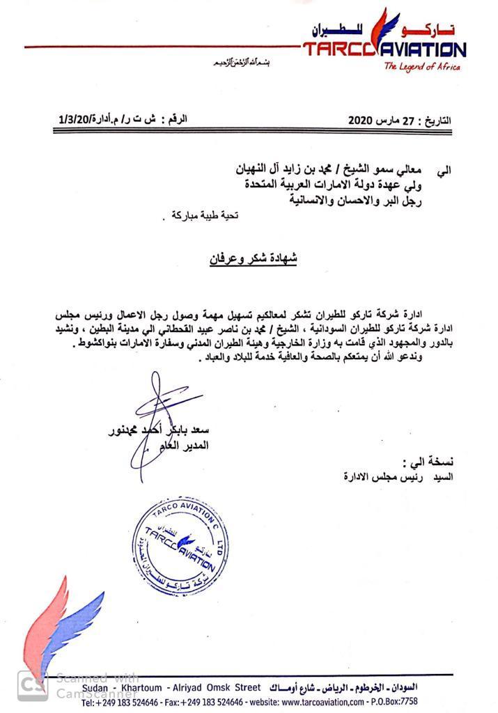 وقد وجهت إدارة شركة "تاركو للطيران " برقية شكر وعرفان، لمعالي سمو الشيخ / محمد بن زايد آل نهيان ولي عهدة دولة الإمارات العربية المتحدة، رجل البر والإحسان والإنسانية، وذلك لشكر معاليه على تسهيل وصول رجل الأعمال، ورئيس مجلس إدارة شركة "تاركو للطيران " السودانية، الشيخ محمد بن ناصر عبيد القحطاني إلى مطار "البطين"، كما أشادت الشركة بالدور الذي قامت به وزارة الخارجية الإماراتية وهيئة الطيران المدني، وسفارة الإمارات بنواكشوط.